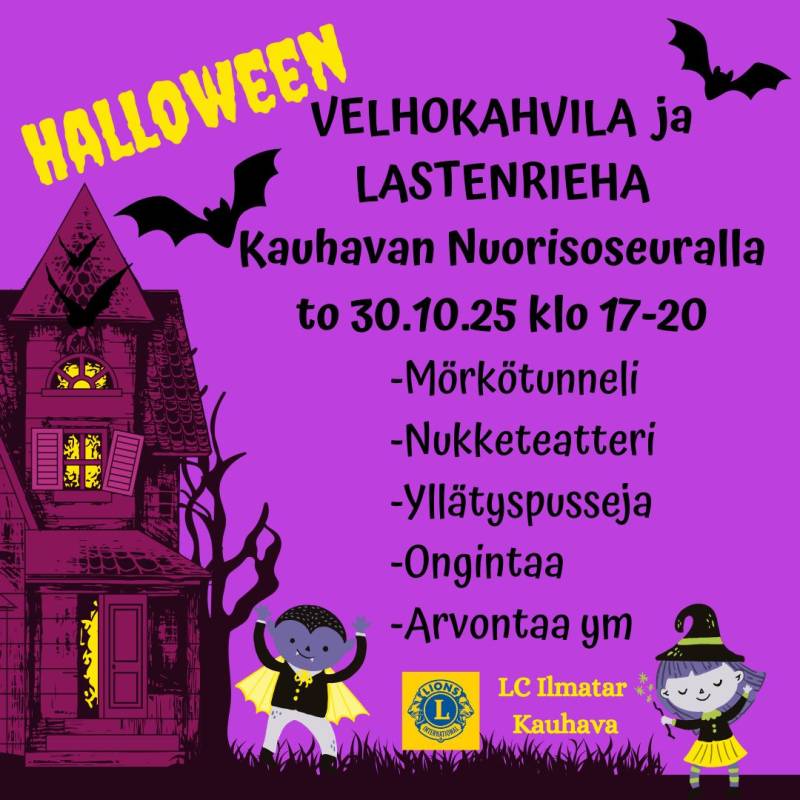 Aloittavan kannattaa suunnata Kauhavan Nuorisoseuralle (osoite: Kauppatie 113), jossa järjestetään perinteinen Velhokahvila ja Lastenrieha. Mukaan kannattaa varata käteistä rahaa, sillä tarjolla on kaikenlaista jännitystä elämään pikkurahalla! Seuraavaksi voi suunnistaa tien toisella puolella olevaan Kauhavan kirjastoon, joka on tunnettu järkyttävästä kauhutunnelista, joka ei sovellu perheen pienimmille. Pikkuväelle onkin mukavaa Halloween-askartelua luvassa sillä aikaa, kun teiniosasto kirkuu kirjaston kalmistossa.