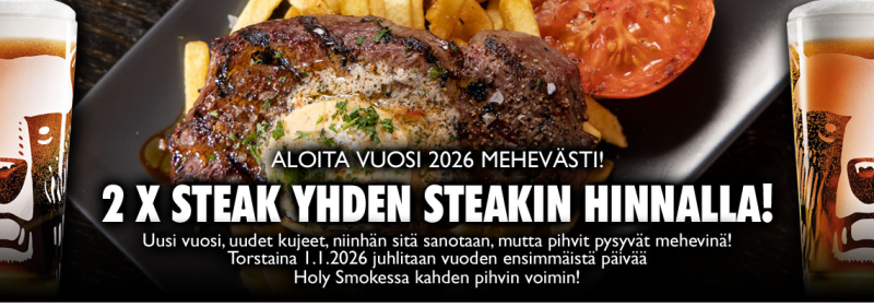 Torstaina 1.1.2026 juhlitaan vuoden ensimmäistä päivää Holy Smokessa kahden pihvin voimin!