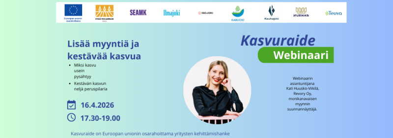 Webinaarin järjestää Kasvuraide-hanke, joka on Euroopan unionin osarahoittama. Kasvuraide on suunnattu Ilmajoen, Isojoen, Karijoen, Kauhajoen, Kurikan ja Teuvan yrityksille.