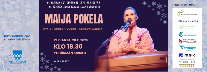 Ylihärmä-seura järjestää Ylihärmän joulunavausillan konsertin Maija Pokela, Nyt on soolon vuoro – Lohdun sanoja.