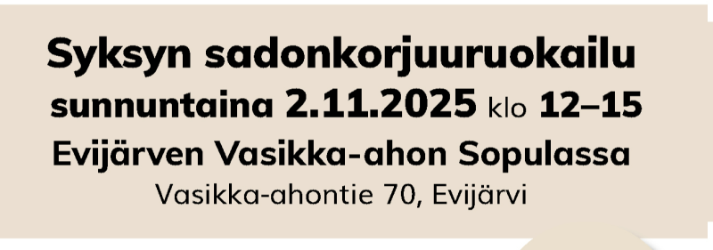 Syksyn sadonkorjuuruokailu järjestetään Evijärven Vasikka-ahon Sopulassa sunnuntaina 2. marraskuuta kello 12-15. Ruokalistalla on lihaperunakeittoa, ropsua ja hilloa sekä kahvia marjapiirakan kera. Ruokailun hinta on 15 euroa henkilöltä ja ruokaa voi käydä ostamassa myös omiin astioihin kotiin vietäväksi. Ruoka on saatavana myös gluteenittomana ja laktoosittomana.